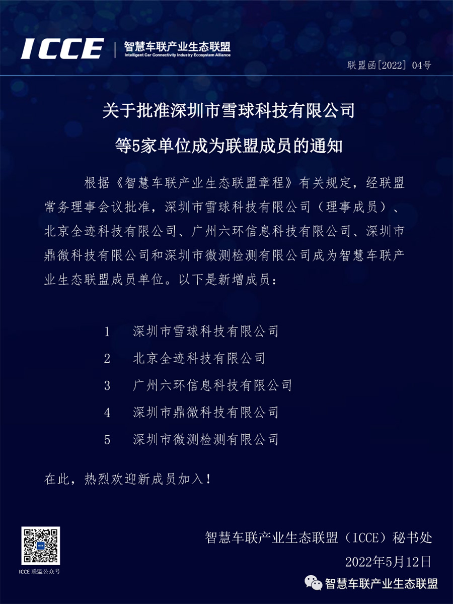 5月12日,經聯盟常務理事會議批準,深圳市微測檢測有限公司、深圳市雪球科技有限公司、北京全跡科技有限公司、廣州六環信息科技有限公司、深圳市鼎微科技有限公司成為智慧車聯產業生態聯盟成員單位,發文如下: